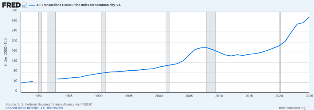 The answer to that lies in the word “affordable.” Yes, there’s a lot of ongoing construction, but all of the examples mentioned above are of homes that will be sold or rented at market rates—and the market is a beast. The house price index in Staunton, for example, rose from 100 in the year 2000 to 185 in 2020, which is to say, home prices rose 85% in that period, or an average of just over 4% a year. But by 2025 the index had jumped to 299.48, zipping along at a brisk 23% average annual increase. Translated into dollars, that boosted the February median home sales price in the Staunton-Augusta-Waynesboro (SAW) area to $330,000, according to local realtor Rick Kane, who’s been tracking these stats for a couple of decades.