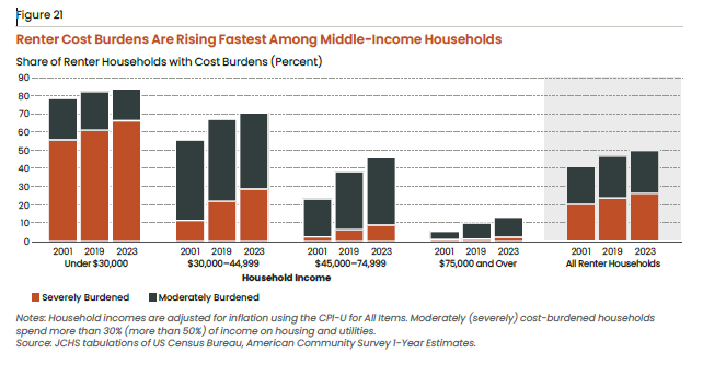 (While these bar charts are for the U.S. as a whole, they track the local situation pretty closely. For example, a statistically dated Central Shenandoah Planning District housing study released last year reported that more than 42% of Staunton and Waynesboro renters were cost-burdened, or roughly the percentage for 2019 shown above for “all renter households.”)